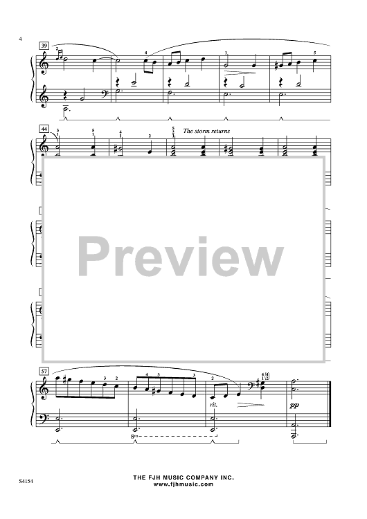 Students will love this fascinating early intermediate level piece that musically depicts the electrifying stages of a storm. From the churning eighth-note pattern and dramatic chords in the beginning, to the middle legato section where a melodic line is played for sixteen measures, this piece expresses a variety of dramatic personality. All of the sections of this piece are well crafted, fit comfortably under the hands, and offer a wide array of articulations, dynamics, and expressive qualities.