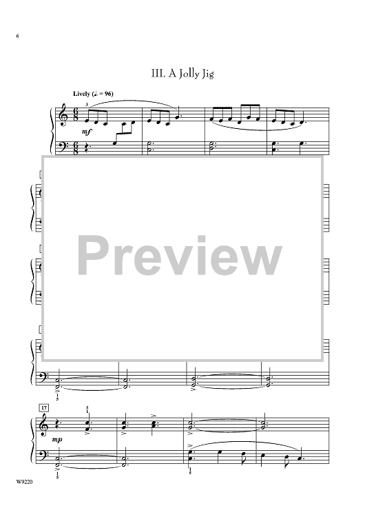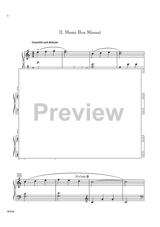 Great for students just moving to the intermediate level, this piece makes an ideal choice to ease young pianists into longer musical forms. Movements include: Classic Fanfare, a speedy, energetic pronouncement; Music Box Minuet, a question and answer dance between left and right hand; and A Jolly Jig, a joyful close with a Scottish flavor.