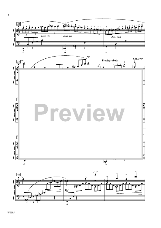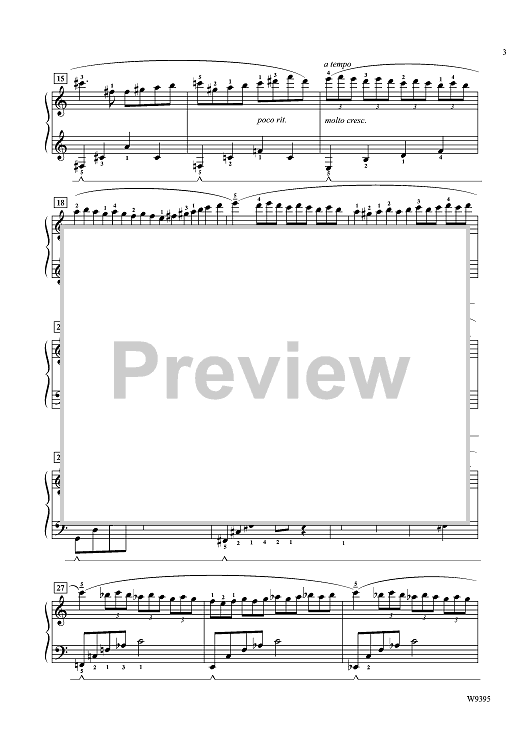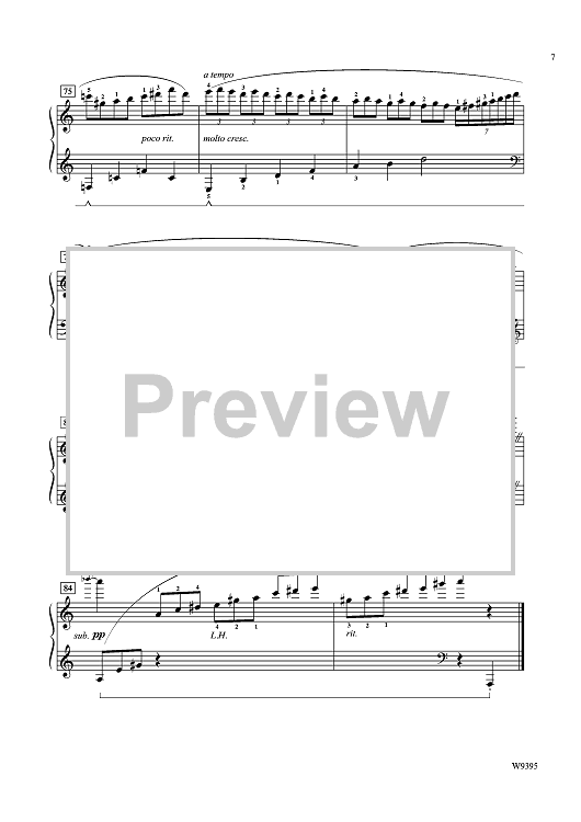 A haunting and mysterious piece in A minor that is sure to appeal to fans of magic and fantasy. Features chromatic melodies and extended broken L.H. chords, cross rhythms 2 vs 3, L.H. cross over melody, and quick hand shifts changing registers. Lots of accidentals and ledger lines.