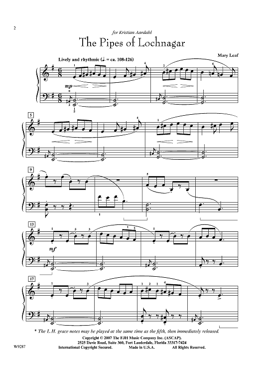 A colorful and rhythmic piece evoking the sounds of Scottish bagpipes, it will evidently take you to the mysterious mountains of Scotland. The Lydian mode adds to the exotic feel of this easily learned 6/8 recital piece.