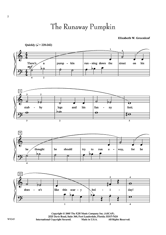 This elementary piece tells the story of a pumpkin that's running away because it knows what fate lies ahead. Your students will be in suspense as they play the middle staccato section. Also features four measure legato phrases and staccato playing with lyrics which will have you singing to find out what happens to The Runaway Pumpkin.