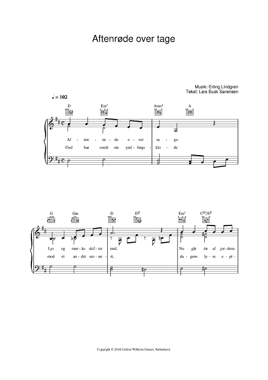Digital Sheet Music for Aftenrøde Over Tage by Erling Lindgren, Lars Busk Sorensen scored for Piano/Vocal/Chords; id:388456