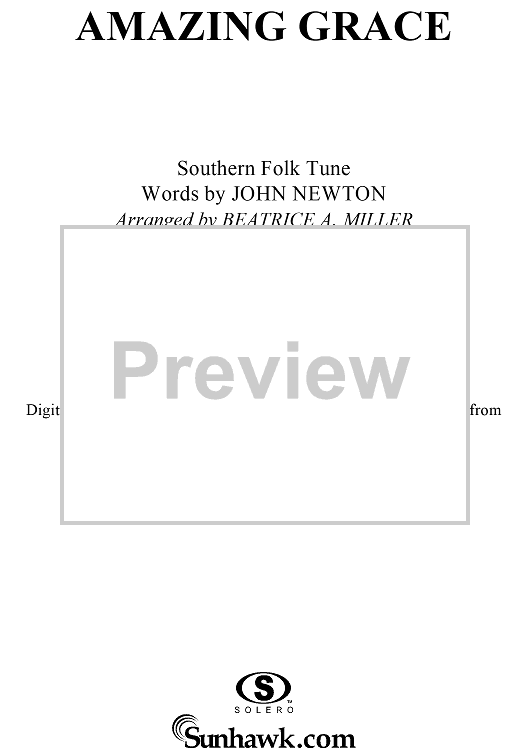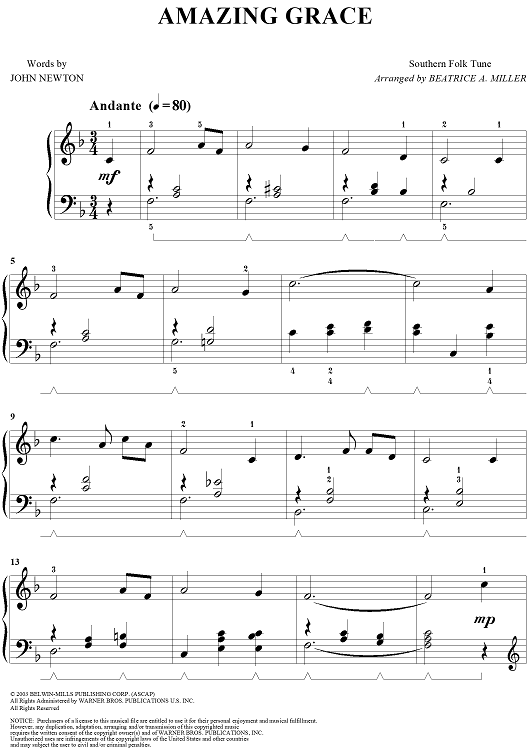 Digital Sheet Music for Amazing Grace by John Newton, Beatrice A. Miller, Southern Folk Tune scored for Easy Piano; id:297136