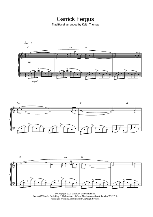 Digital Sheet Music for Carrick Fergus by Charlotte Church scored for Piano/Vocal/Chords; id:378839