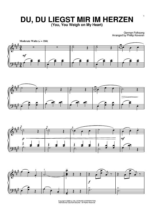 Digital Sheet Music for Du, Du Liegst Mir Im Herzen (You, You Weigh On My Heart) by scored for Piano; id:388562
