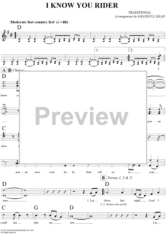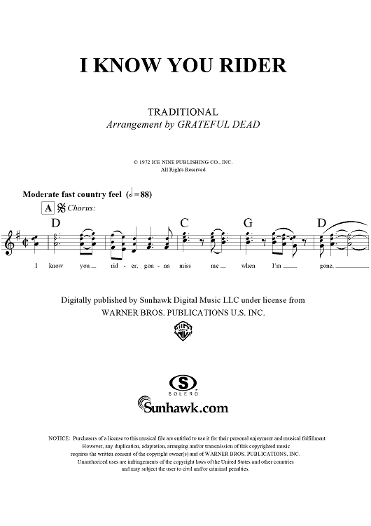 Digital Sheet Music for I Know You Rider by Grateful Dead, Traditional scored for Lead Sheet; id:293959