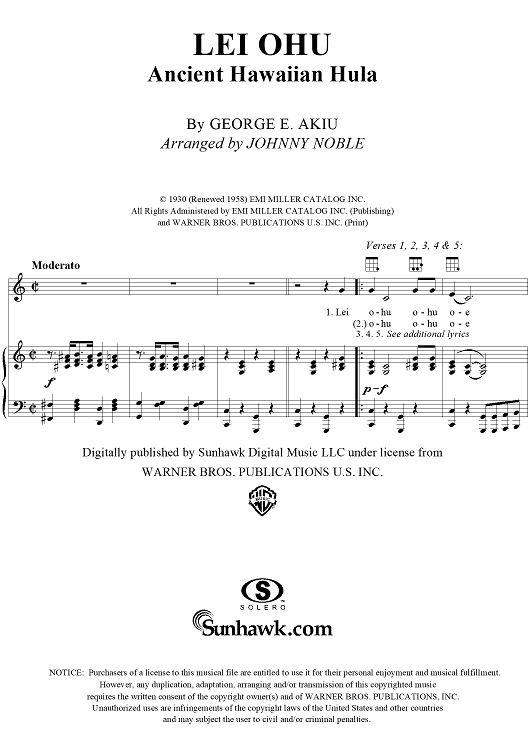 Digital Sheet Music for Lei Ohu (A Hawaiian Hula) by Johnny Noble, George E. Akiu scored for Piano/Vocal/Chords; id:277990