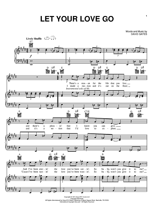 Digital Sheet Music for Let Your Love Go by Bread, David Gates scored for Piano/Vocal/Chords; id:388648