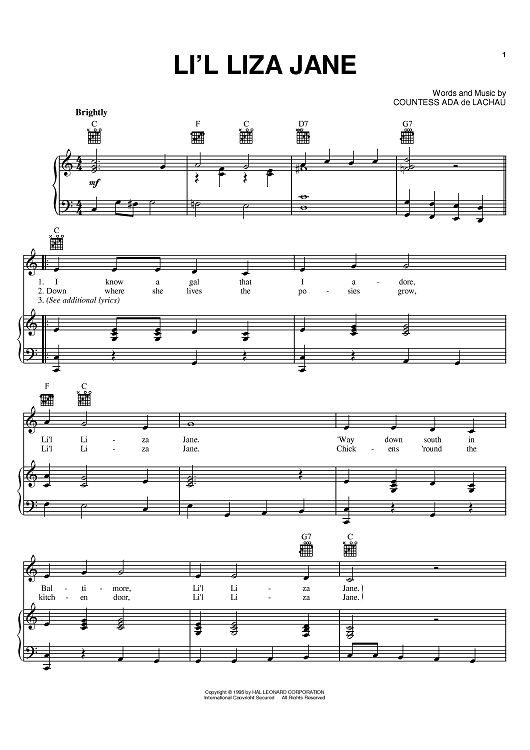 Digital Sheet Music for Li'l Liza Jane (Go Li'l Liza) by Countess Ada De Lachau scored for Piano/Vocal/Chords; id:368483