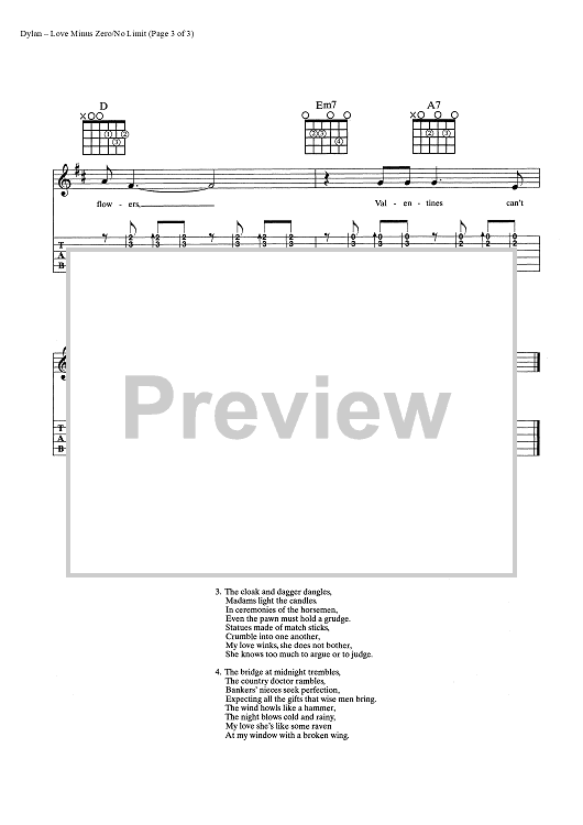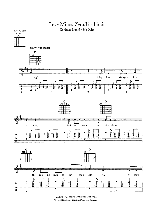 Digital Sheet Music for Love Minus Zero/No Limit by Bob Dylan scored for Guitar Tab/Vocal/Chords; id:445443