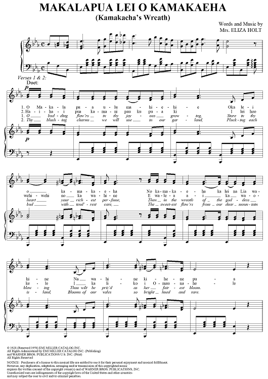 Digital Sheet Music for Makalapua Lei O Kamakaeha (Kamakaeha's Wreath) by Eliza Holt scored for Piano/Vocal/Chords; id:266537