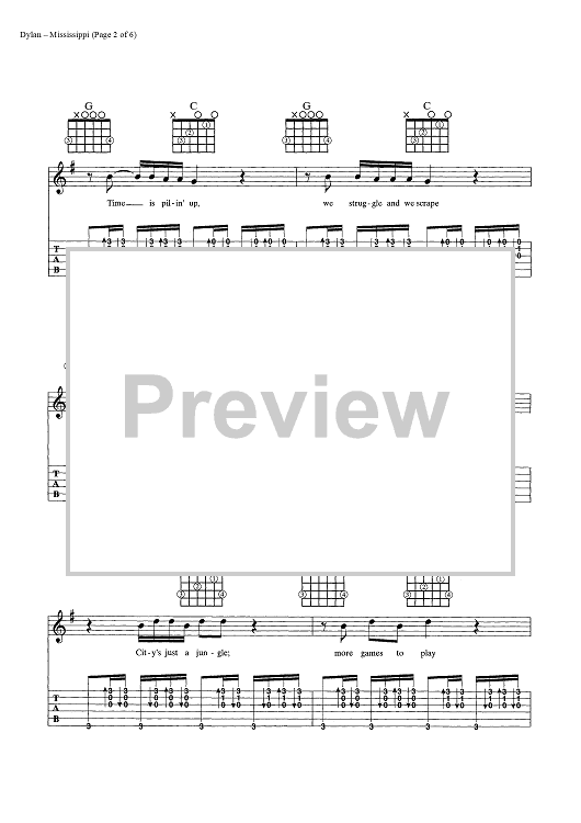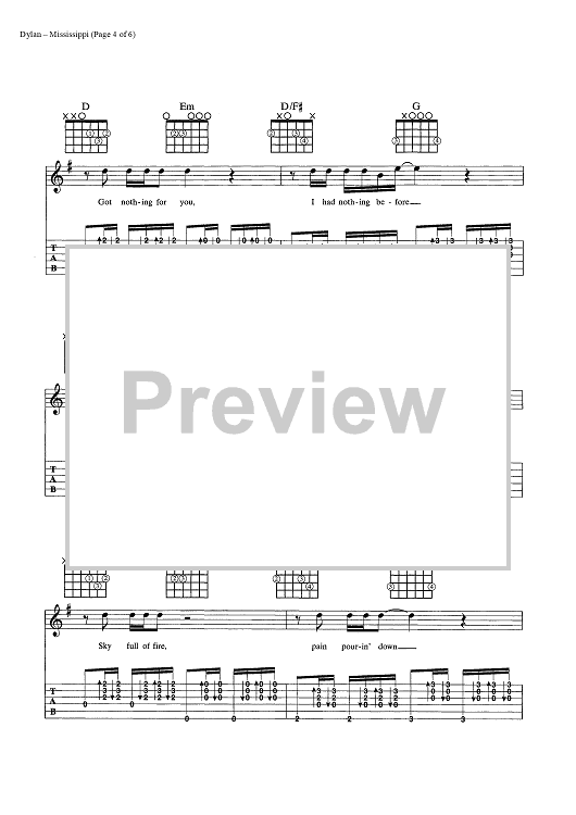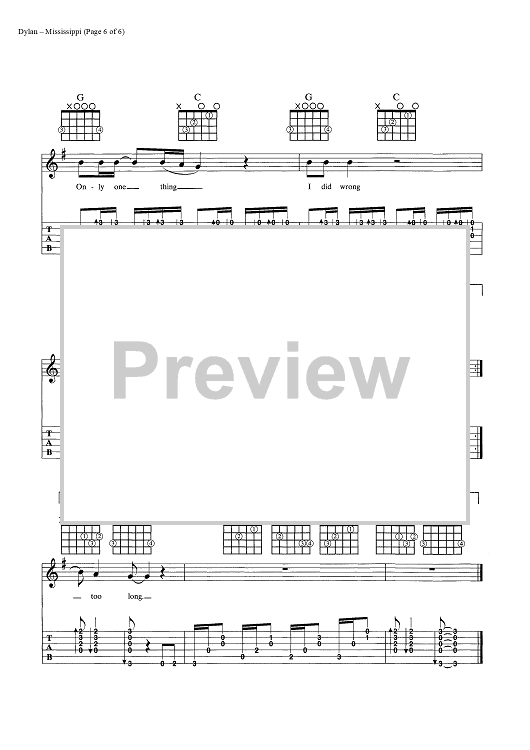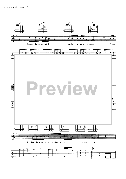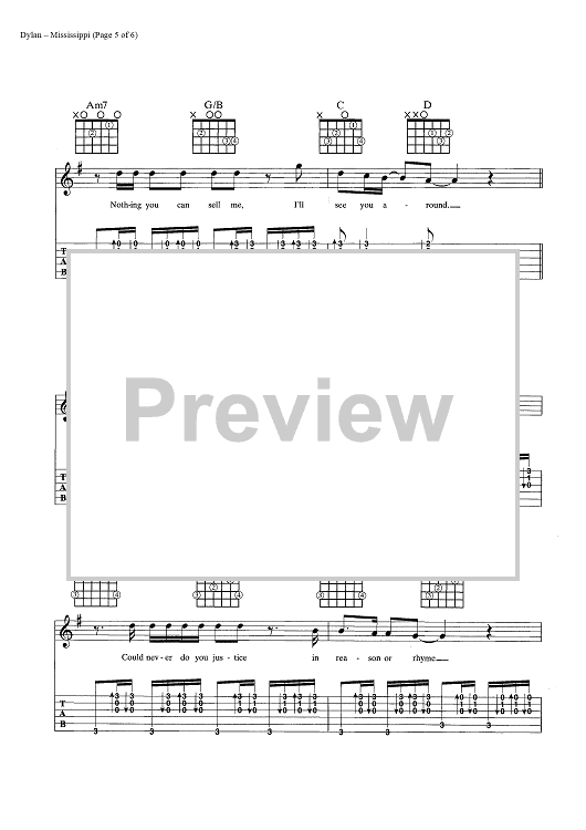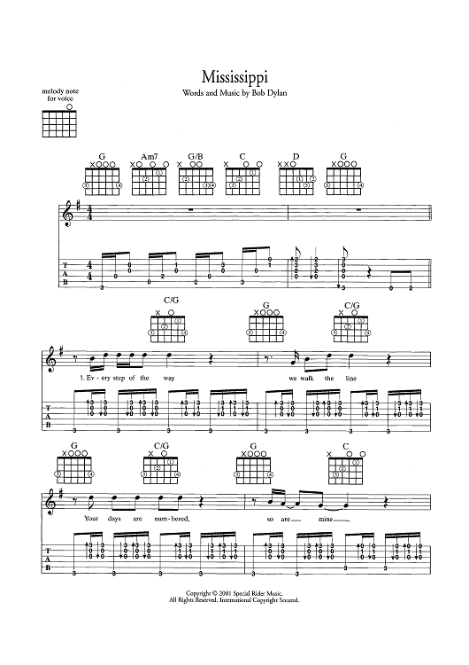 Digital Sheet Music for Mississippi by Bob Dylan scored for Guitar Tab/Vocal/Chords; id:445390