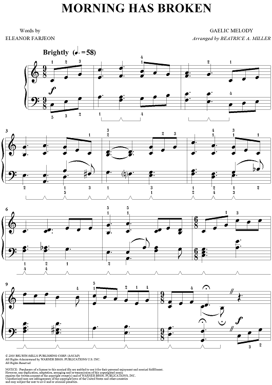 Digital Sheet Music for Morning Has Broken by Beatrice A. Miller, Eleanor Farjeon, Gaelic Melody scored for Easy Piano; id:297137