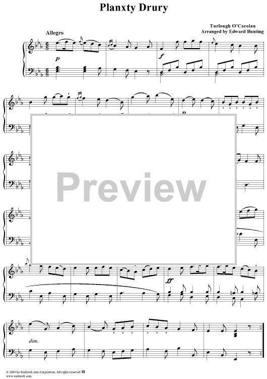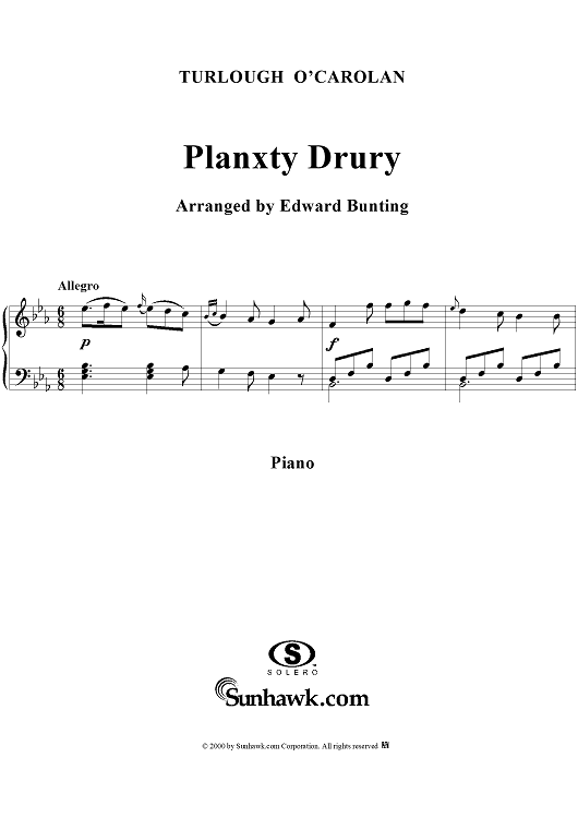 Digital Sheet Music for Planxty Drury by , Turlough O'Carolan, Edward Bunting scored for Piano Solo; id:165089