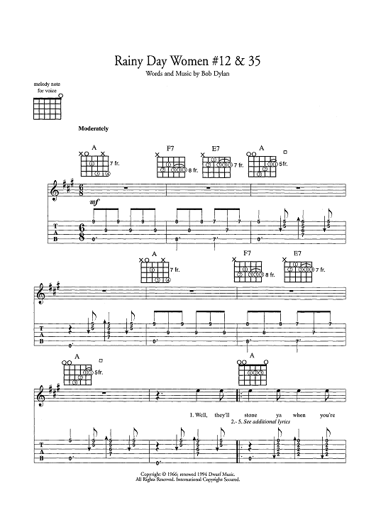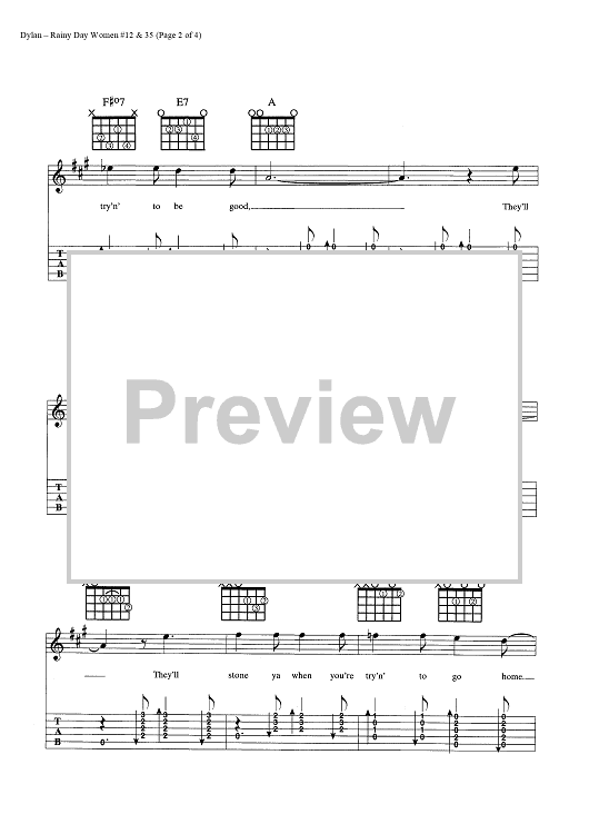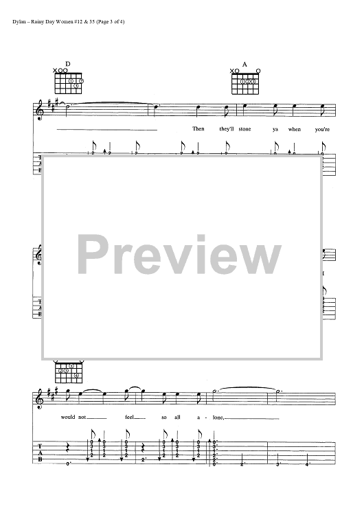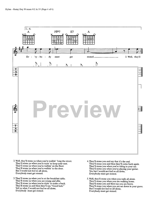 Digital Sheet Music for Rainy Day Women #12 & 35 by Bob Dylan scored for Guitar Tab/Vocal/Chords; id:445401