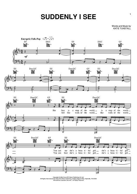 Digital Sheet Music for Suddenly I See by Katie Tunstall, KT Tunstall scored for Piano/Vocal/Chords; id:393264