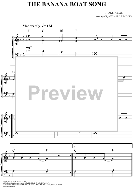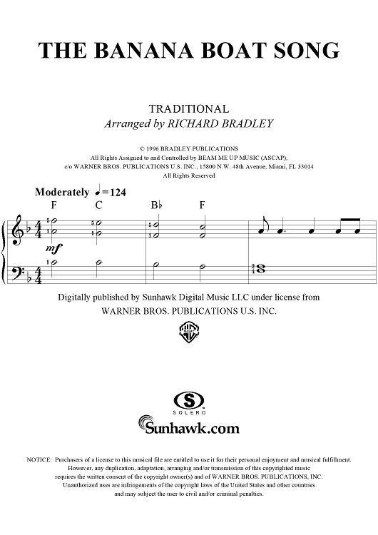 Digital Sheet Music for The Banana Boat Song by Richard Bradley, Traditional scored for Easy Piano; id:293005