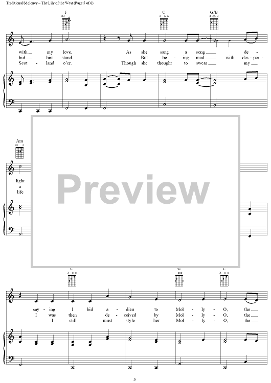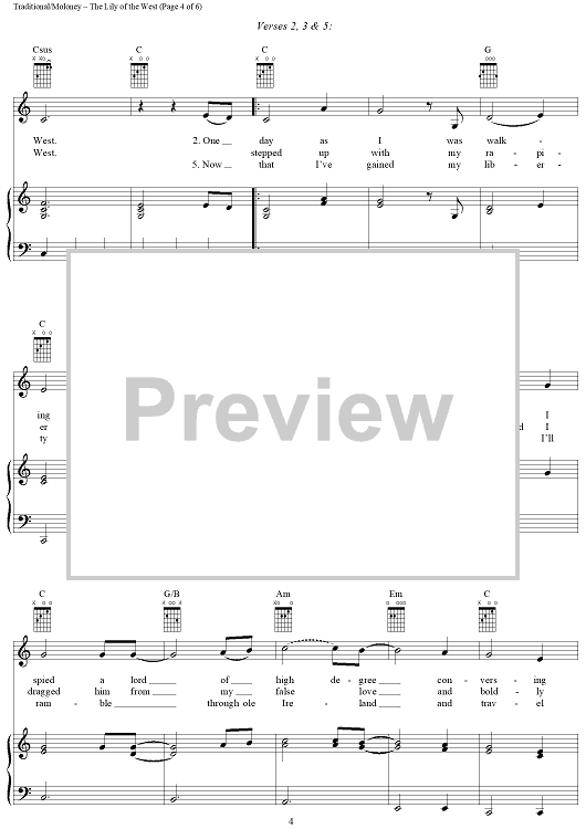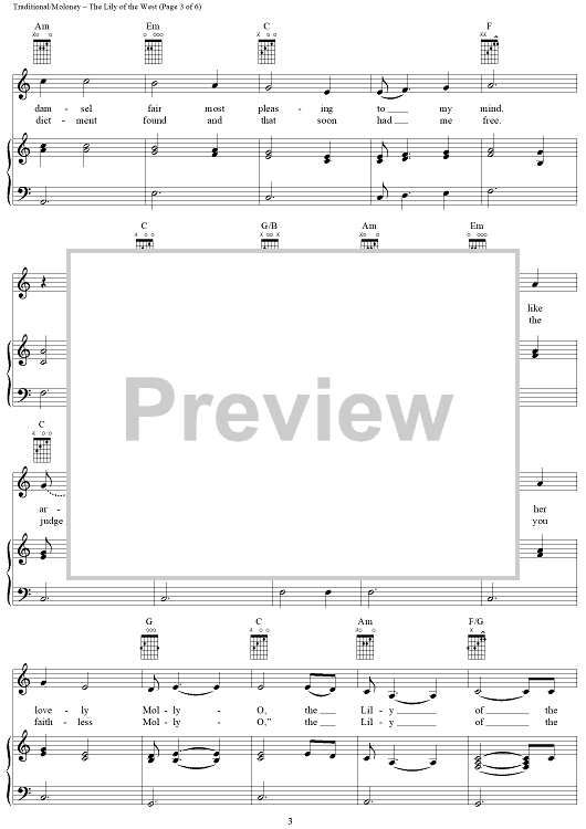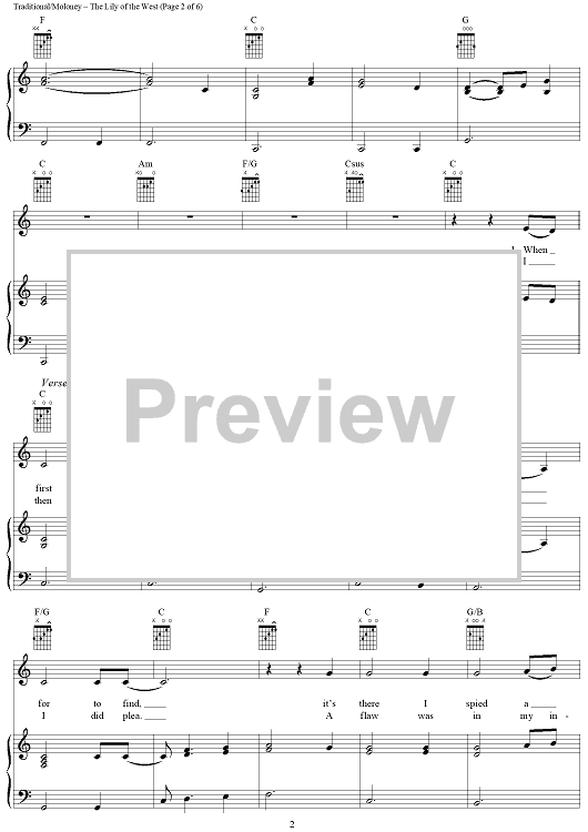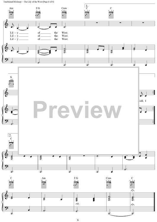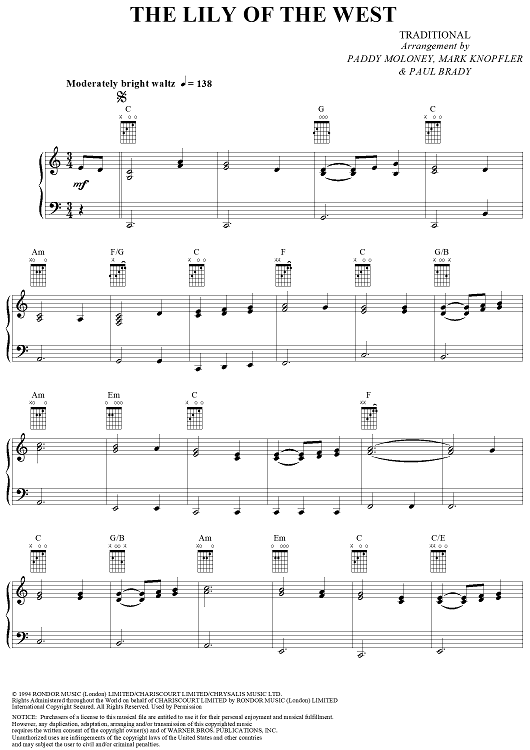 Digital Sheet Music for The Lily of the West by Mark Knopfler, The Chieftains, Paddy Moloney, Paul Brady, Traditional scored for Piano/Vocal/Chords; id:260174