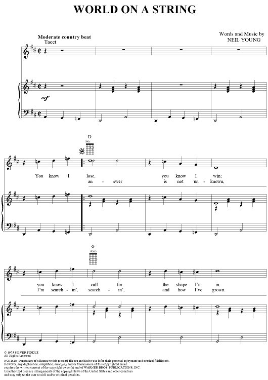 Digital Sheet Music for World On a String by Neil Young scored for Piano/Vocal/Chords; id:262819