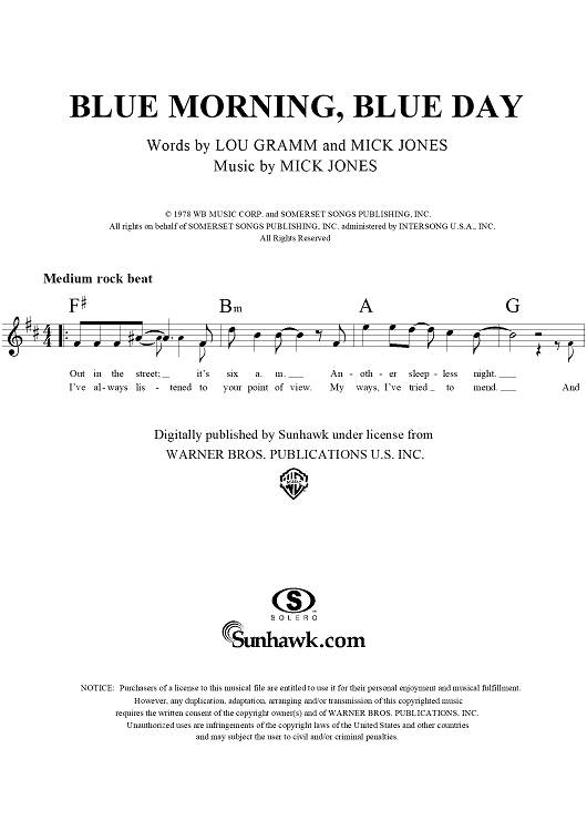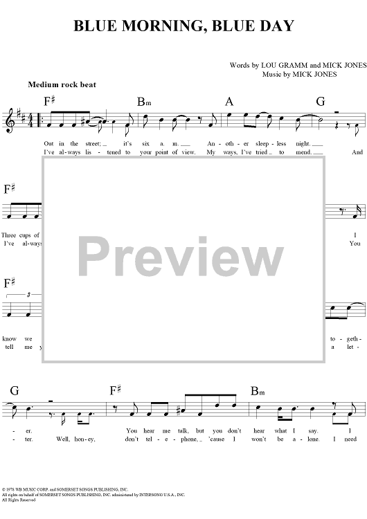 Digital Sheet Music for Blue Morning Blue Day by Foreigner, Lou Gramm, Mick Jones scored for Lead Sheet; id:120290