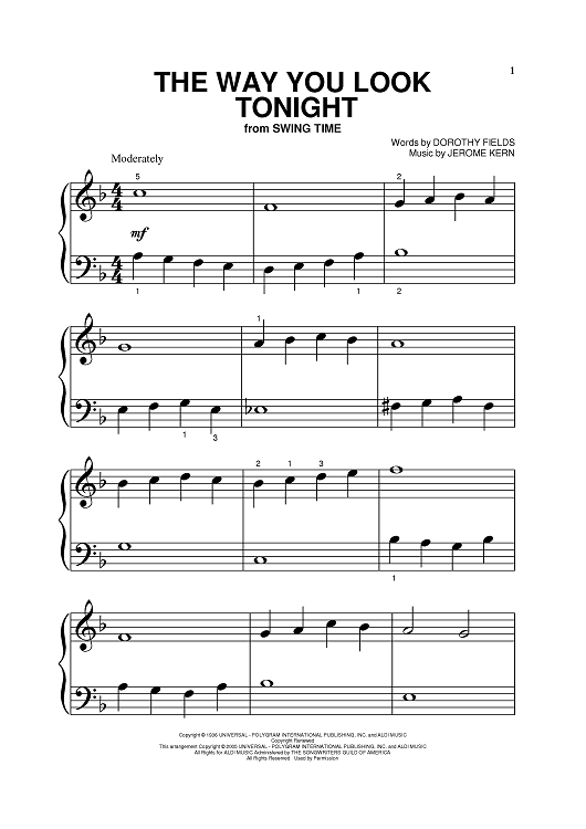 Digital Sheet Music for The Way You Look Tonight by Frank Sinatra, Fred Astaire, Billie Holiday, Rod Stewart, Jerome Kern, Dorothy Fields, Michael Buble, Slick Rick scored for Easy Piano; id:385180