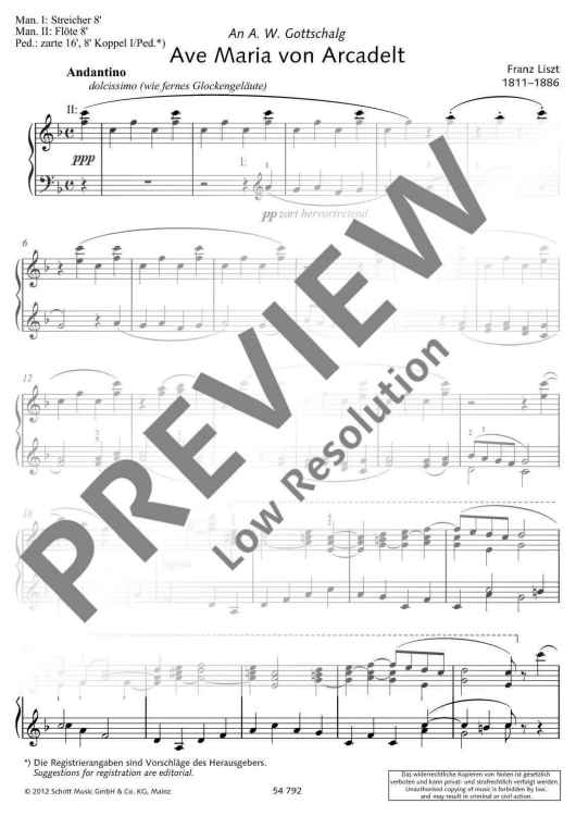 Franz Liszt composed his lyrical-meditative organ fantasia on the Ave Maria von Arcadelt in Rome in 1863. In contrast to his major virtuoso works, this charming genre piece can even be easily played on smaller (double-manual) instruments, even without swell-organ and reeds. The 'Liszt organ' at the village church of Denstedt near Weimar, which was built by the Peternell brothers in 1859/60 and has survived in its original state, may be used as an example. It did not become known until in 1927 that the Ave Maria attributed to Jakob Arcadelt (around 1505-1568) was a revised version by the composer Pierre-Louis-Philippe Dietsch (1808–1865) who used the melody of Arcadelt's chanson Nous voyons que les hommes which he then harmonized into his own Romantic four-part choral setting and to which he added the sacred text as a contrafactum. Our separate edition wants to make this rather 'poetic', yet quite easy-to-play organ work without any major technical difficulties accessible to a large circle of interested people.