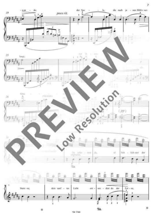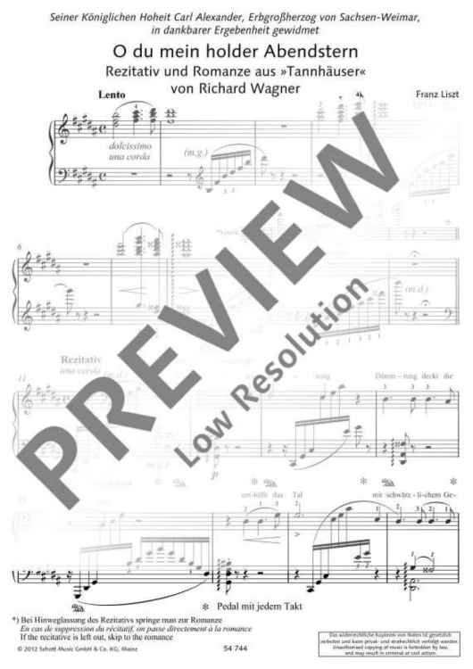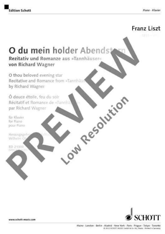 Arrangements for the piano, transcriptions and opera paraphrases take up a large part in Franz Liszt's complete œuvre. He even arranged scenes from the music dramas of Richard Wagner. The transcription of 'Lied an den Abendstern' comes from the third act of the romantic opera Tannhäuser und der Sängerkrieg auf Wartburg. In his transcription of 1849 Liszt kept exactly to Wagner's original but he divided the scene into 'Recitative' and 'Romance'. He transposed the piece to the keys of G sharp minor and A flat major, which sound warmer on the piano and which also allow for a more easy-to-play romantic piano setting. Liszt uses the cantilena of the violoncellos in Wagner's original as tonal highlight with octaves in the descant. A transcription that is beautiful to listen to for both pianist and audience and perfectly suitable for concert performances and recitals.