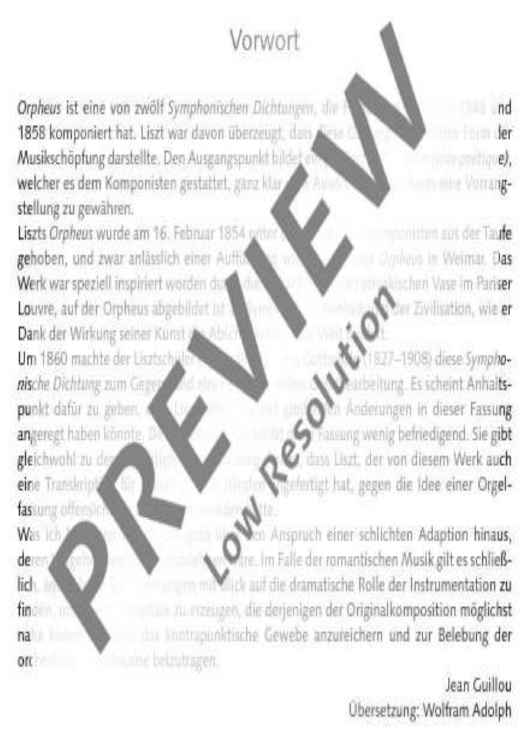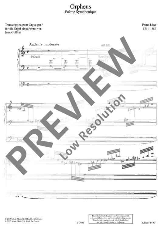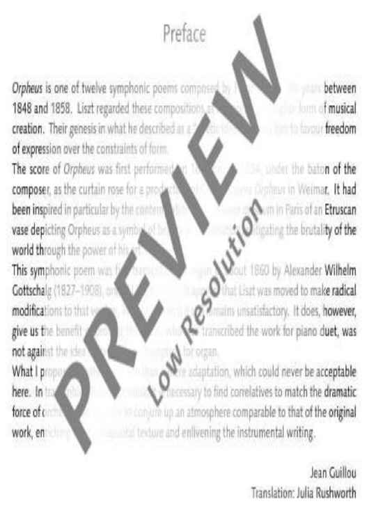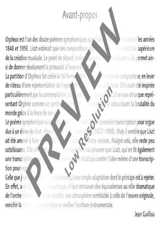 Orpheus is one of 12 symphonic poems composed by Franz Liszt between 1848 and 1858. Liszt regarded these compositions as representing a higher form of musical creation. Their genesis in what he described as a "poetic idea" allowed him to favour freedom of expression over the constraints of form. The score of 'Orpheus' was first performed on 16 February 1854, under the baton of the composer, as the curtain rose for a production of Gluck's opera 'Orpheus' in Weimar. It had been inspired in particular by the contemplation in the Louvre museum in Paris of an Etruscan vase despicting Orpheus as a symbol of beauty and civilisation, mitigating the brutality of the world through the power of his art. This symphonic poem was first transcribed for organ in about 1860 by Alexander Wilhelm Gottschalk (1827-1908), one of Liszt's pupils. It appears that Liszt was moved to make radical modifications to that version, in spite of which it still remains unsatisfactory. It does, however, give us the benefit of proving that Liszt, who also transcribed the work for piano duet, was not against the idea in itself of a transcription for organ. Jean Guillou's transcription is more than a simple adaptation. As far as Romantic music is concerned, he is responsible for finding appropriate equivalents to the dramatic function of instrumentation to create an atmosphere which comes as close to that of the original composition as possible, to enrich the contrapuntal texture and to contribute to the simulation of the orchestral sound.