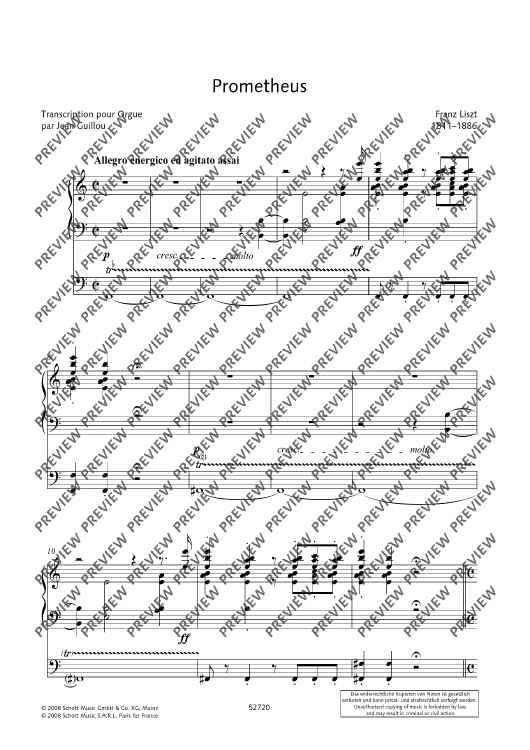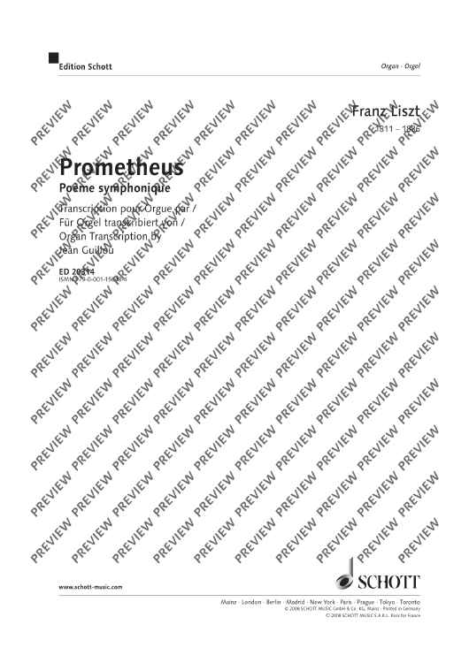 In 1850, on the occasion of a gala performance of 'Der Entfesselte Prometheus' by Herder at the Weimar court theatre, Liszt wrote not only several choral pieces but also an overture which he revised into the Symphonic Poem No. 5 in 1855. Later he arranged the work for 2 pianos and piano duet. The renowned organist and composer Jean Guillou has now arranged this wonderfully dramatic music for the organ. Initially published in France in 1985, the piece is now presented by Schott in a fully reset version, with only a few changes added by the composer.