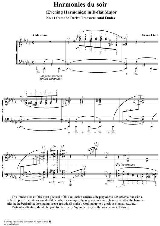 "Transcendental Etude No. 11: Harmonies du soir (Evening Harmonies) in D-flat Major" Sheet Music by Franz Liszt