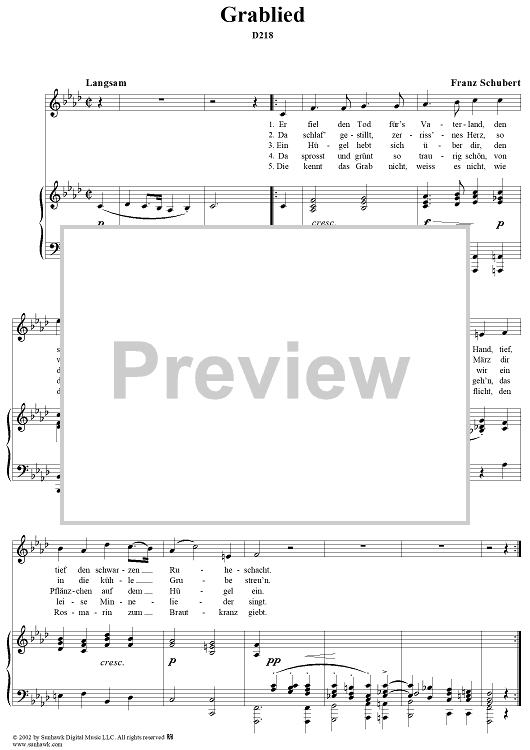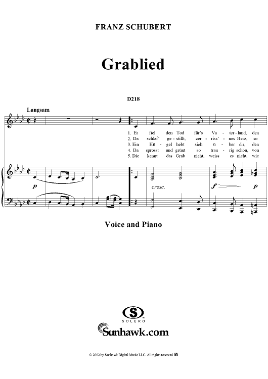 Digital Sheet Music for Grablied, D218 by Franz Schubert scored for Voice/Piano; id:256597