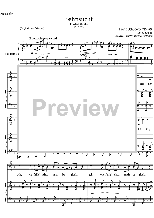 Digital Sheet Music for Sehnsucht Op.39 D636 by , Franz Schubert scored for Soprano or Tenor/Piano; id:338163