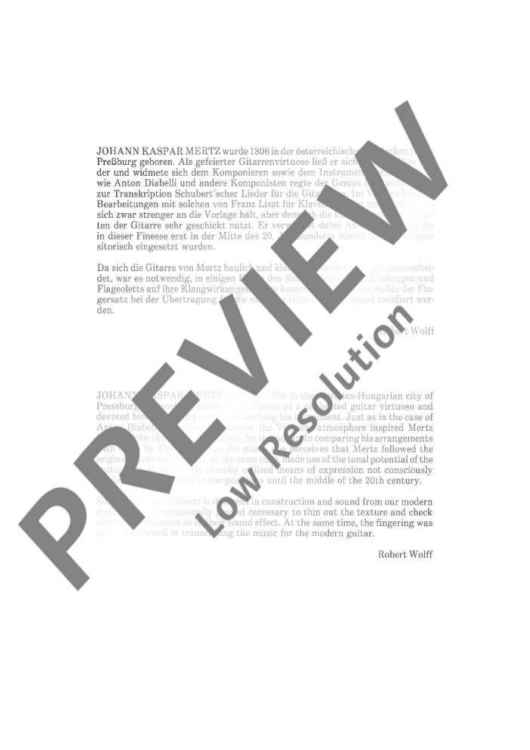 Robert Wolff hat in einigen Fällen den Satz von Mertz (1806-1856) gelichtet und Bindungen und Flageoletts auf ihre Klangwirkungen hin kontrolliert. Die Mertz-Übertragungen sind, neben ihrer Schönheit, auch von historischem Interesse.