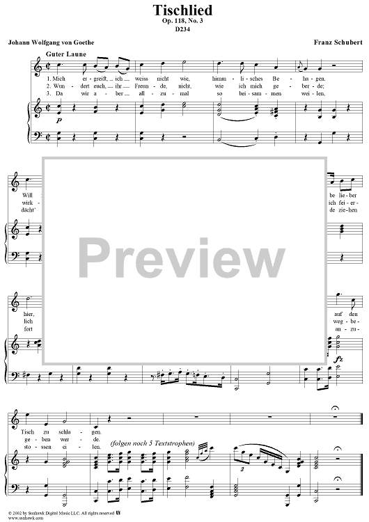 Digital Sheet Music for Tischlied, Op. 118, No. 3, D234 by Franz Schubert scored for Voice/Piano; id:256935