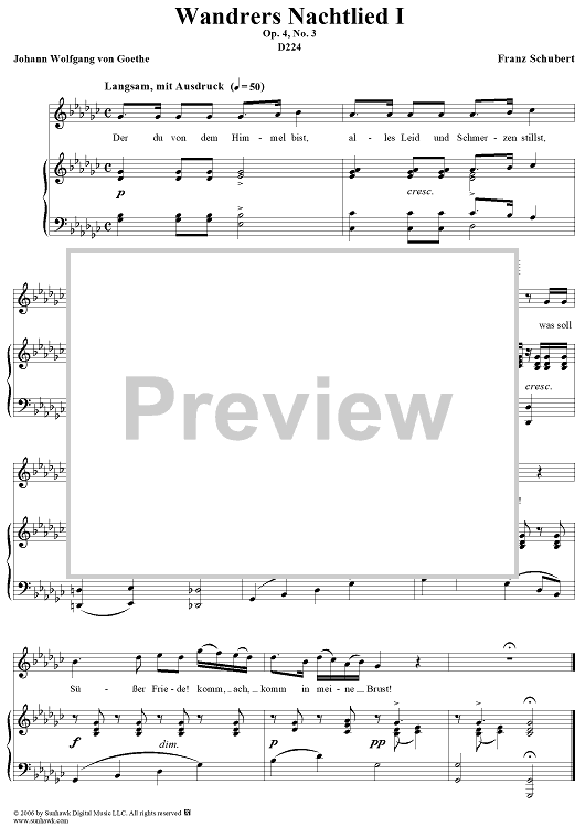 Digital Sheet Music for Wandrers Nachtlied I by Johann Wolfgang von Goethe, Franz Schubert scored for Voice/Piano; id:318259