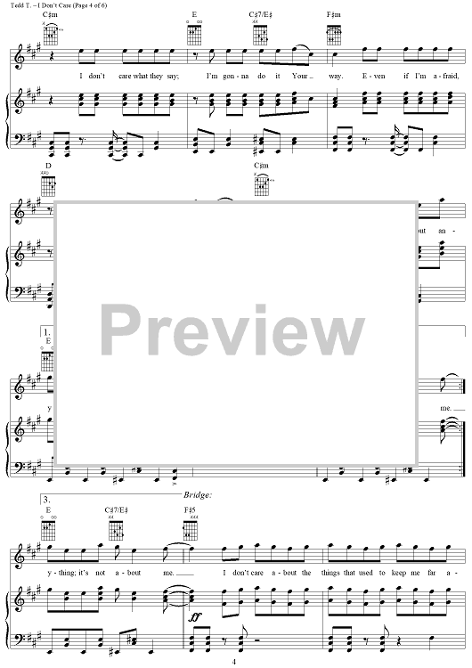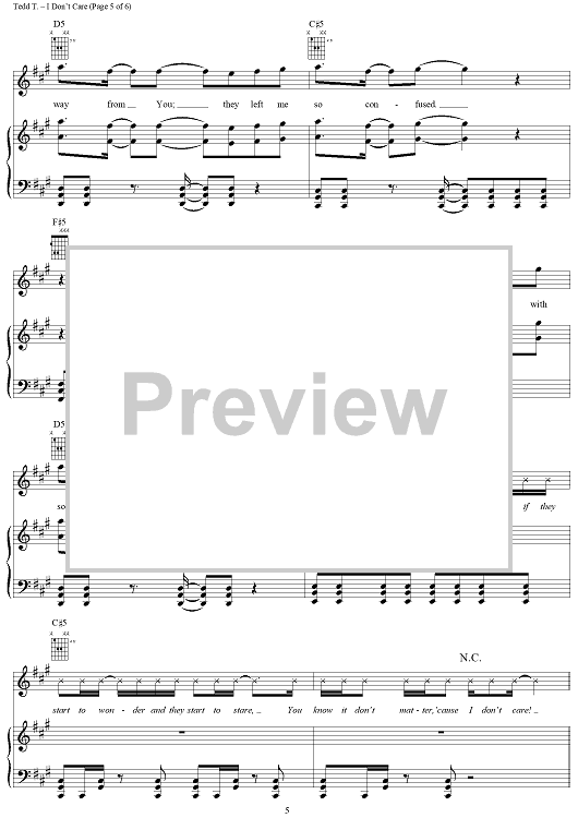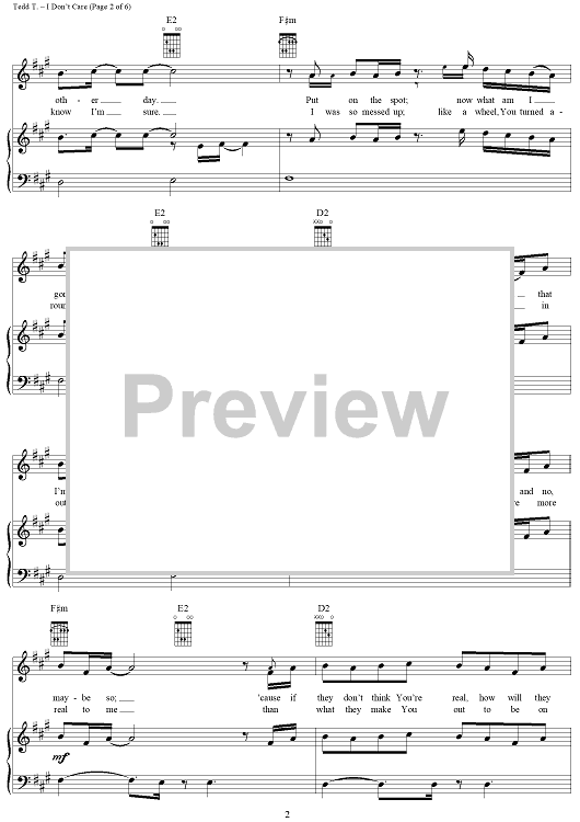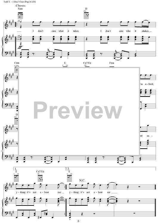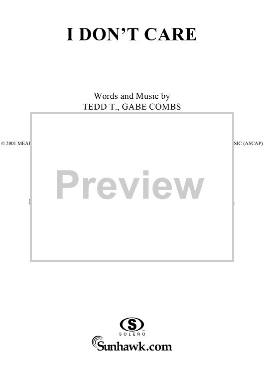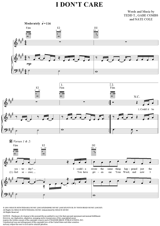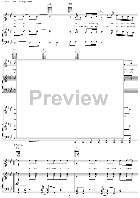 Digital Sheet Music for I Don't Care by Tedd T, Plus One, Nate Cole, Gabe Combs scored for Piano/Vocal/Chords; id:292067