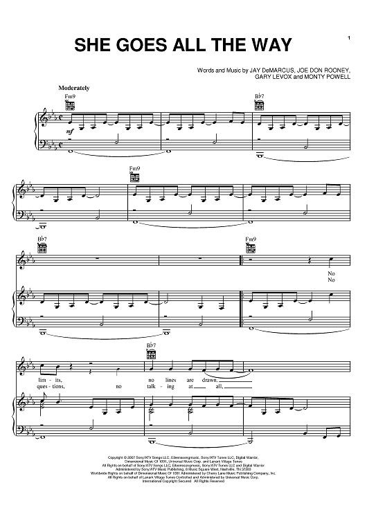 Digital Sheet Music for She Goes All The Way by Rascal Flatts, Monty Powell, Gary Levox, Jay DeMarcus, Joe Don Rooney scored for Piano/Vocal/Chords; id:402759