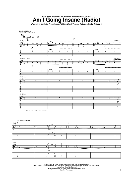 Digital Sheet Music for Am I Going Insane (Radio) by Bill Ward, Black Sabbath, Geezer Butler, Tony Iommi, Ozzy Osbourne scored for Guitar Tab; id:379529