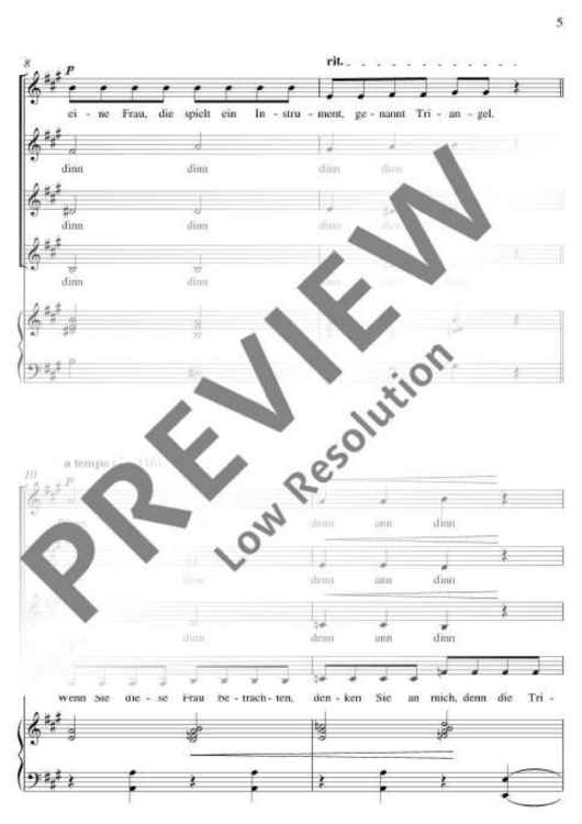 Georg Kreisler - das ist scharfer, tiefsinnig schwarzer Humor! Die Singphoniker haben Georg Kreislers bekannteste Lieder für Männerensemble arrangiert und auf CD aufgenommen. Die zugehörige Notenausgabe für Frauenchor SSAA mit Klavierbegleitung ist bei Schott Music erschienen (Georg Kreisler - Lieder und Chansons, ED 22736). Ergänzend dazu sind Einzelausgaben aller Lieder aus dem Notenalbum erhältlich: Dass es sich bei dem Triangel um ein höchst unterschätztes Instrument handelt, liegt auf der Hand. Wie gut, dass Kreislers zweideutige Hommage an dieses Instrument dessen Stellenwert endgültig klärt. Dieses ansprechende Arrangement mit Kreislers humoristischem Text sorgt im Konzert garantiert für ausgelassene Stimmung.