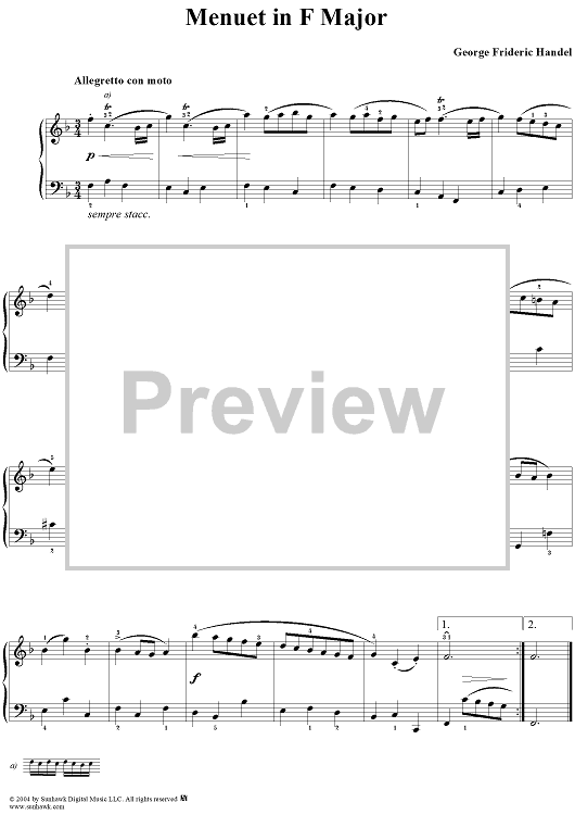 Digital Sheet Music for 7 Pieces: No. 7, Menuet in F Major by George Frideric Handel scored for Piano Solo; id:295309