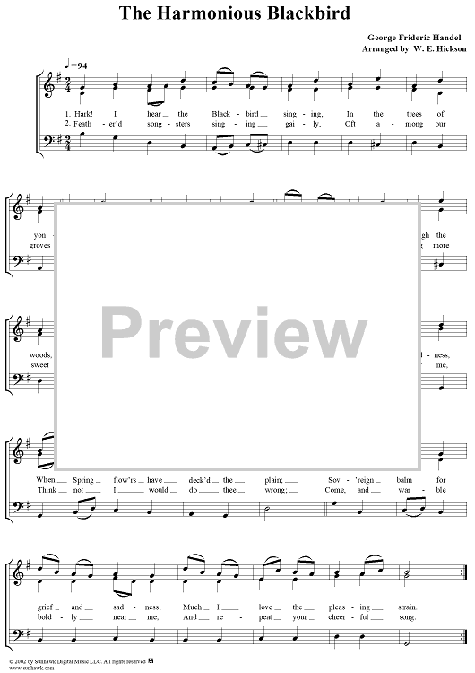 Digital Sheet Music for Harmonious Blackbird, The by George Frideric Handel, William E. Hickson scored for Three-part Mixed Chorus; id:266895