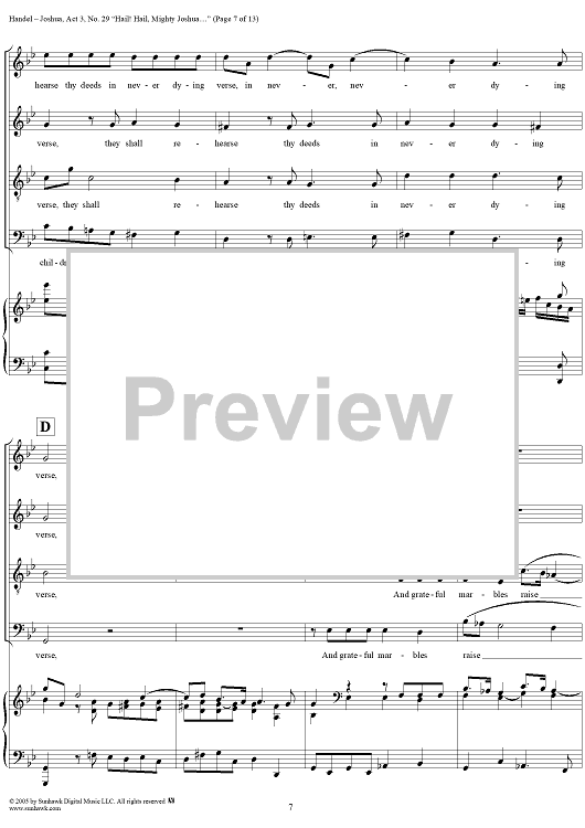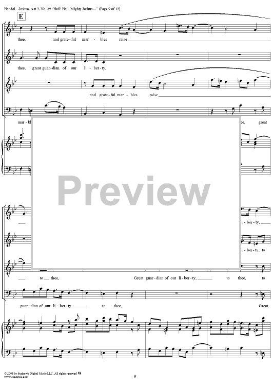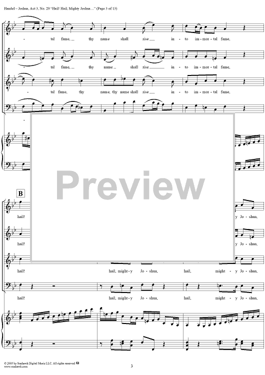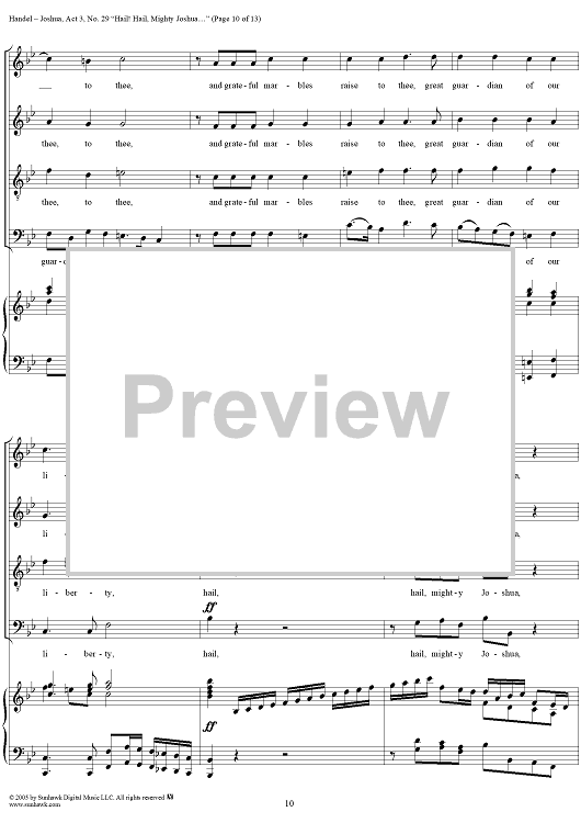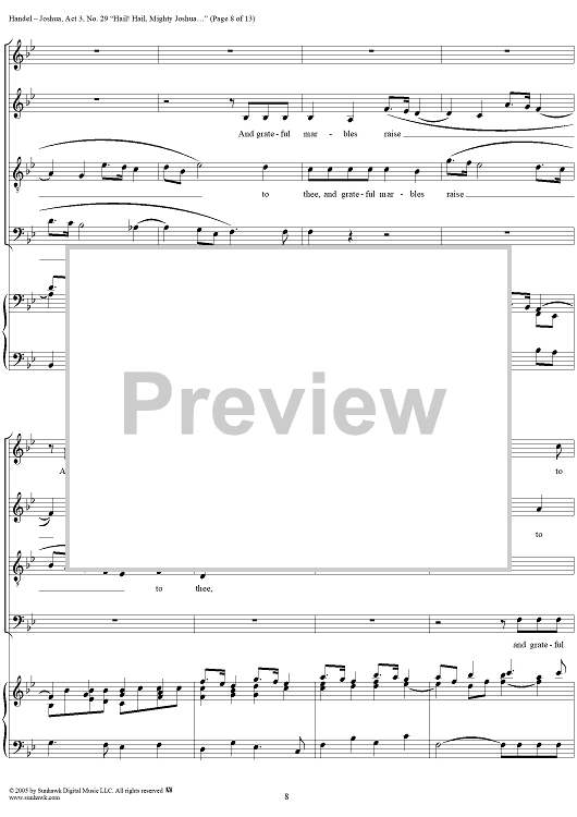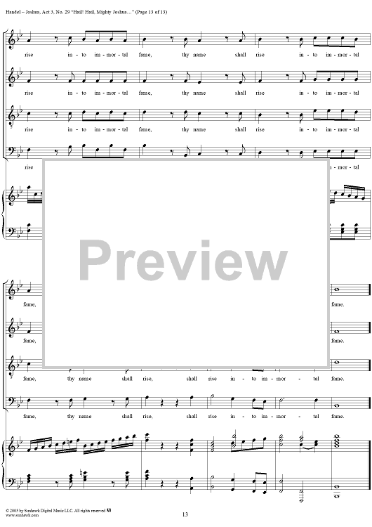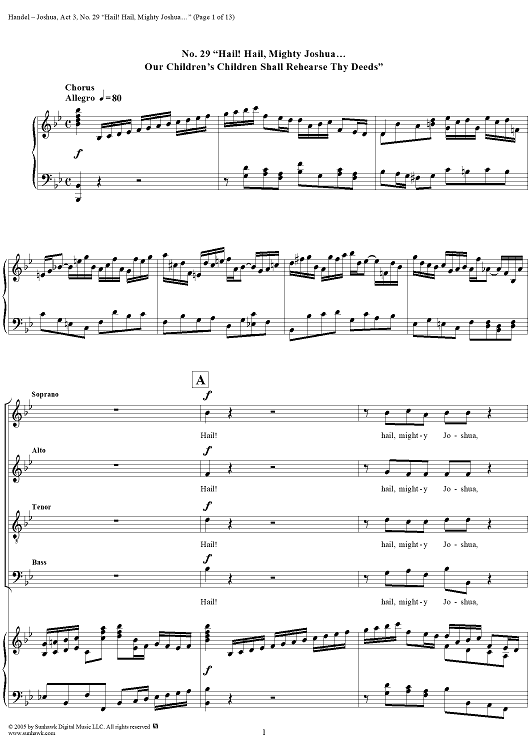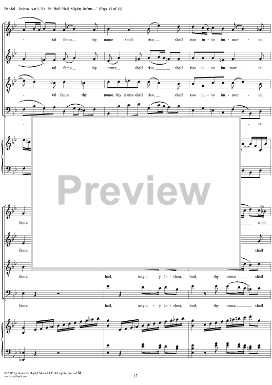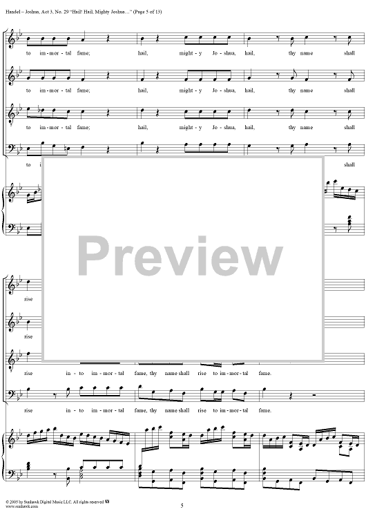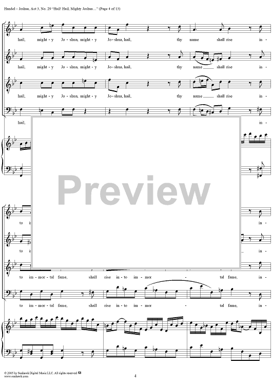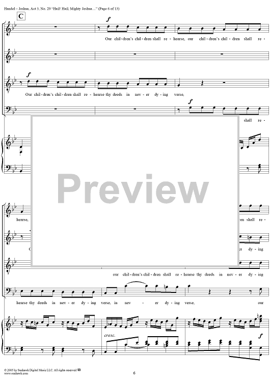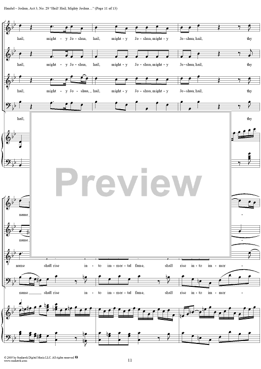 Digital Sheet Music for Joshua, Act 3, No. 29: "Hail! hail, mighty Joshua... Our children's children shall rehearse thy deeds" by George Frideric Handel scored for Vocal Score; id:306747