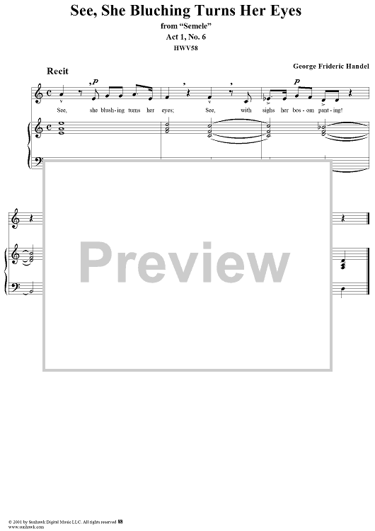 Digital Sheet Music for Semele Oratorio, Act 1, no.6: See, She Blushing Turns Her Eyes, Recit. by George Frideric Handel scored for Voice/Piano; id:266150