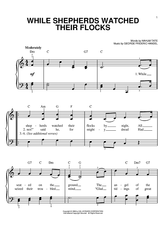 Digital Sheet Music for While Shepherds Watched Their Flocks by George Frideric Handel, Nahum Tate scored for Easy Piano; id:375266