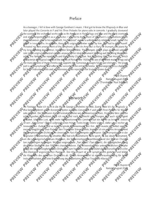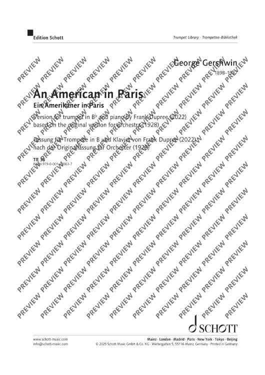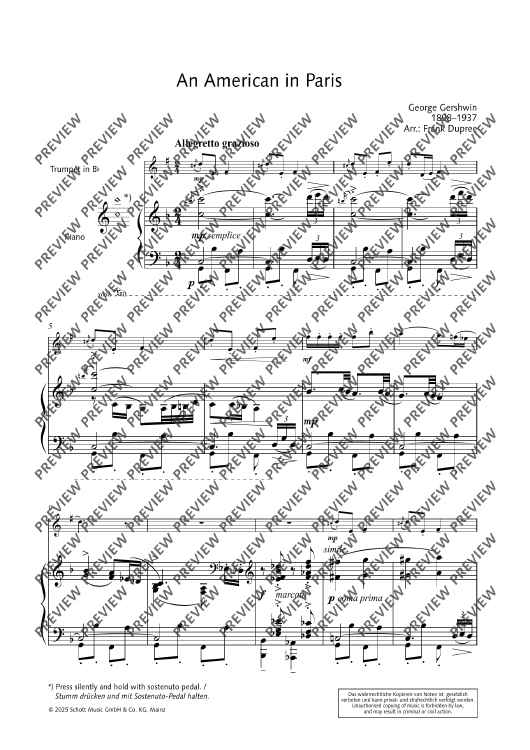 Gershwin's famous symphonic sound of Paris in the 1920s was arranged for trumpet and piano by conductor and pianist Frank Dupree. A delightful and colorful expansion of the repertoire for duo instrumentation.