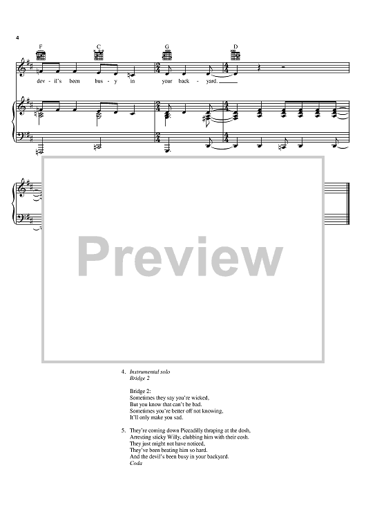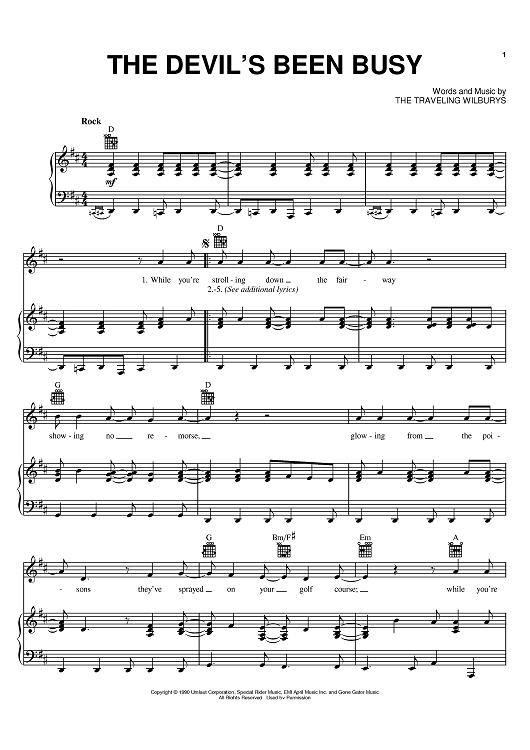Digital Sheet Music for The Devil's Been Busy by Bob Dylan, George Harrison, Tom Petty, Jeff Lynne, The Traveling Wilburys scored for Piano/Vocal/Chords; id:402452