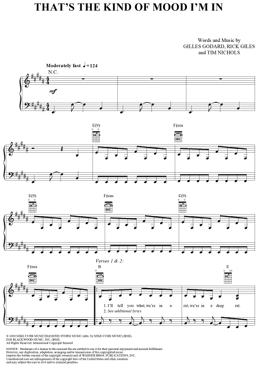 Digital Sheet Music for That's the Kind of Mood I'm in by Patty Loveless, Rick Giles, Tim Nichols, Gilles Godard scored for Piano/Vocal/Chords; id:288568