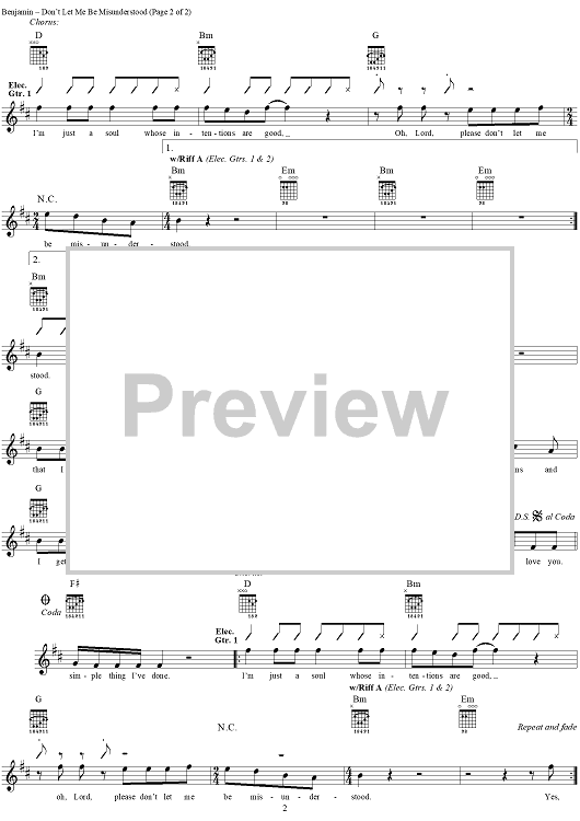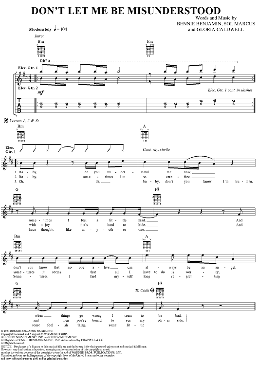 Digital Sheet Music for Don't Let Me Be Misunderstood by The Animals, Bennie Benjamin, Sol Marcus, Gloria Caldwell scored for Guitar Tab/Vocal; id:285013