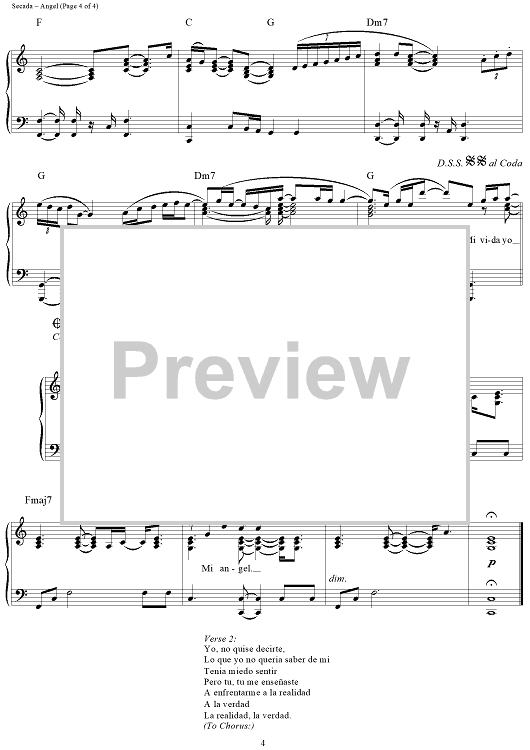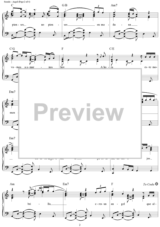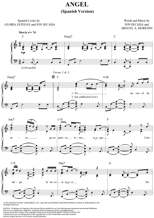 Digital Sheet Music for Angel (Spanish Version) by Gloria Estefan, Jon Secada, Miguel A. Morejon scored for Piano/Vocal/Chords; id:119883