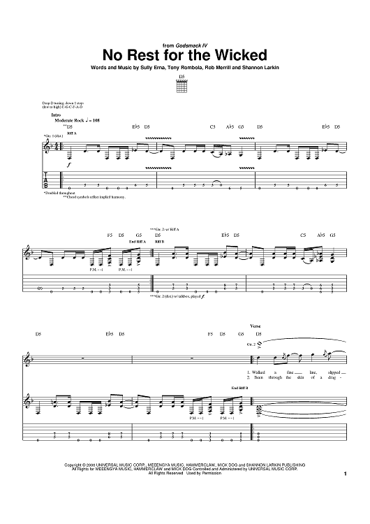 Digital Sheet Music for No Rest For The Wicked by Godsmack, Rob Merrill, Tony Rombola, Shannon Larkin scored for Guitar Tab; id:391484
